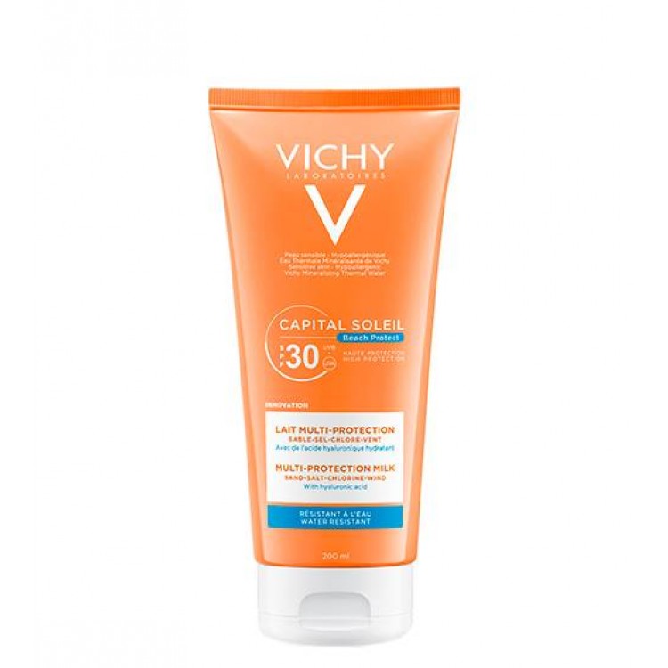 Vichy Capital Soleil Leite Multiproteção SPF30 - O Leite Multiproteção Beach Protect FPS 30 com fórmula hidratante com ácido hialurónico de rápida absorção e sem manchas brancas. Resistente à água e areia. Ajuda a reduzir a secura cutânea causada pela águ