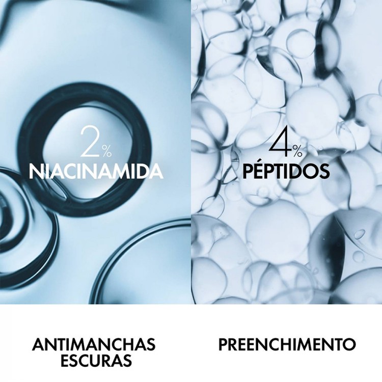 4% Péptidos, 2% Niacinamida, Frações de Probióticos, 10% de Água Vulcânica Vichy.