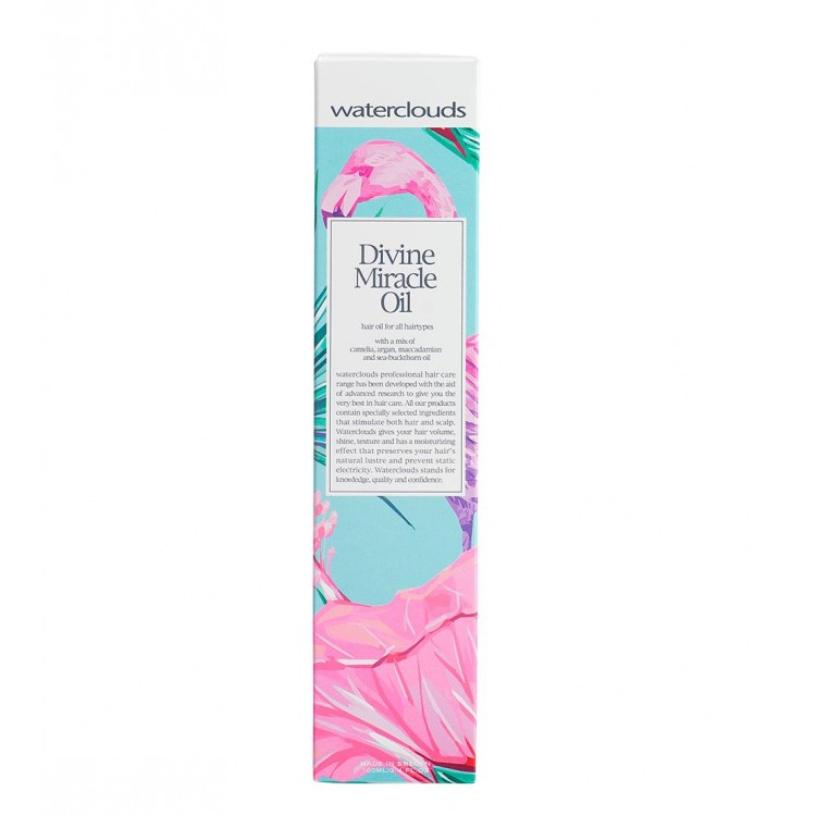 Waterclouds Divine Miracle Oil 100ml: Fórmula imediatamente absorvida pelo cabelo, dando-lhe brilho e um acabamento sedoso sem ficar pesado nem com resíduos. Contém uma mistura de quatro óleos diferentes, de camélia, noz de macadâmia, argão e espinheiro