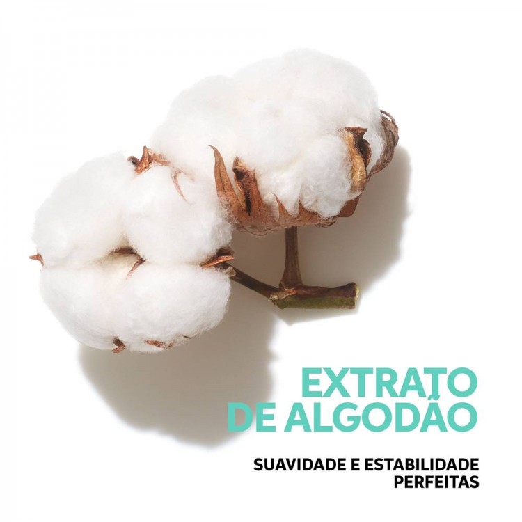 Enriquecido com extrato de flor algodão que proporciona brilho e suavidade ao cabelo.