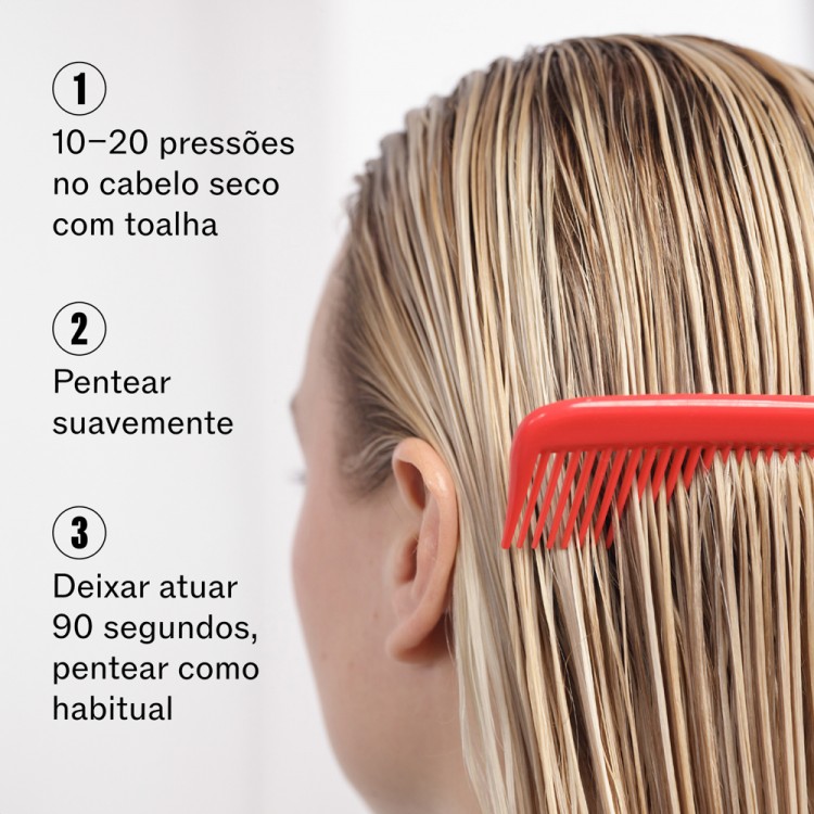 Como aplicarAplicar 10 a 20 doses no cabelo lavado e previamente seco com uma toalha. Distribuir suavemente no cabelo com a ajuda de um pente. Deixar atuar durante 90 segundos antes de secar e pentear o cabelo. Não passar por água. Secar e pentear como habitualmente.