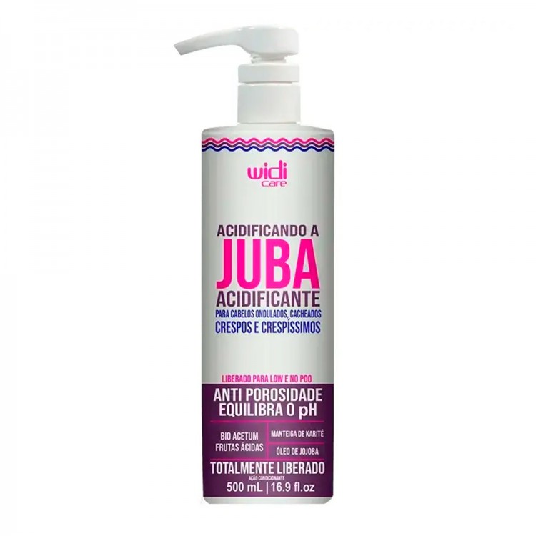 O acidificante Juba da Widi Care, é um tratamento direcionado para todos os tipos de curvaturas que se encontram porosas (com alta porosidade), desvitalizadas, sem brilho e com frizz. A sua fórmula inteligente conta com ativos vegetais que irão controlar o pH do fio, neutralizando a porosidade, proporcionando brilho e suavidade. É adequado para cabelos ondulados, encaracolados, crespos e crespíssimos. Adequado para técnicas low poo e no poo.